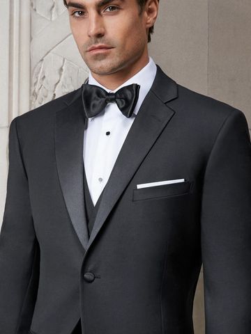 Model is Shown Wearing a Pre-Tied Bow Tie with our Notched Lapel Tux, Optional Vest, and a Classic Pointed Collar Tuxedo Dress Shirt with Plain Front with French Cuffs.