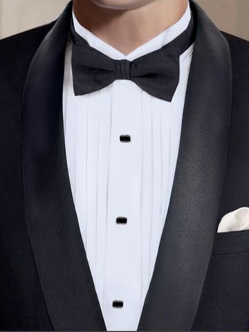 Model is Shown Wearing a Pre-Tied Bow Tie with our Shawl Collar Lapel Black Tuxedo, and our Classic Wing Tip Tuxedo Dress Shirt Half Pleated with French Cuffs.