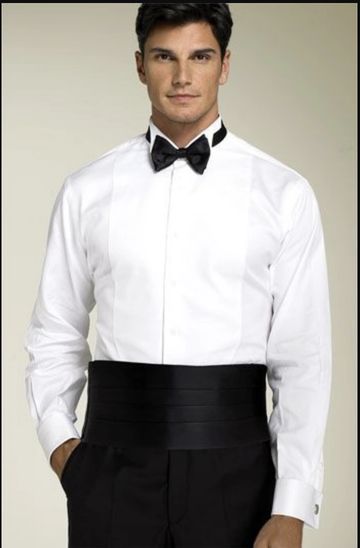 Our model is shown wearing our 100% Woven Silk Pre-Tied Bow Tie along with the Matching 100% Woven Silk Cummerbund with our Classic Wing Tip Tuxedo Dress Shirt with Half Pleated Front and French Cuffs.